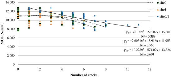 Another factor influencing the strength properties of wood is the presence of cracks, which can be called interruptions in the continuity of the material structure. The impact of the number of cracks on individual planes of sawn timber on the MOE results is presented in Figure 8. In most cases, cracks in the wood structure are caused by desorption changes. The damage is more intense in the area of the fiber cross-section. Studies have shown that as the number of cracks increase, the values of MOE noticeably decrease. This observation confirms the results of previous research conducted by Schajer et al. [26], Olsson et al. [58,61], Burchelt et al. [17], and Yu et al. [62] concerning the effect of the presence of cracks on the timber strength index determined using the modulus of elasticity. The Spearman’s rank correlation coefficient for wide planes labeled as 0 and 1 had slightly negative values of R = −0.342 and R = −0.356, respectively. In the case of analyzing the impact of cracks occurring on both wide planes (0 and 1), there was a strongly negative value of R = −0.741, which indicates a particularly negative effect of their presence on MOE.