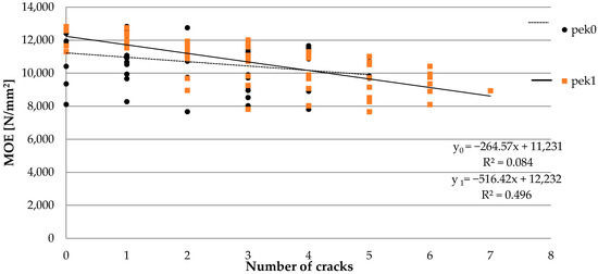 Despite considerable variability in the distribution of narrow cracks up to 1 mm (labeled as 0) and those characterized by a width of over 1 mm (labeled as 1) in the tested sawn timber, their effect on the MOE results was determined (Figure 9). The outcomes did not show an effect of the presence of narrow cracks on the investigated parameter. On the other hand, in the case of wider ones, an adverse effect on the MOE results was confirmed. The reason for this is a greater depth of cracks in the structure of timber. Spearman’s rank correlation coefficient for pek0 showed a slightly negative impact of R = −0.342, while the effect of wide cracks (pek1) was strongly negative with R = −0.741.