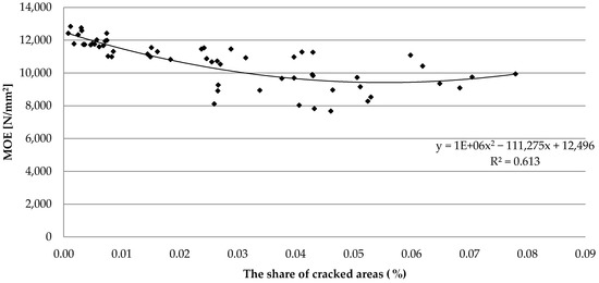 Verification of the cracks’ surface share in the investigated pine sawn timber allows for the evaluation of secondary damage in the tested piece (Figure 10). The result of the average share of the cracked surface was approx. 0.03%. The distribution of cracks on the planes of timber had a strong negative effect on the outcomes of MOE. The Spearman’s rank correlation coefficient was R = −0.824 for the analyzed features.