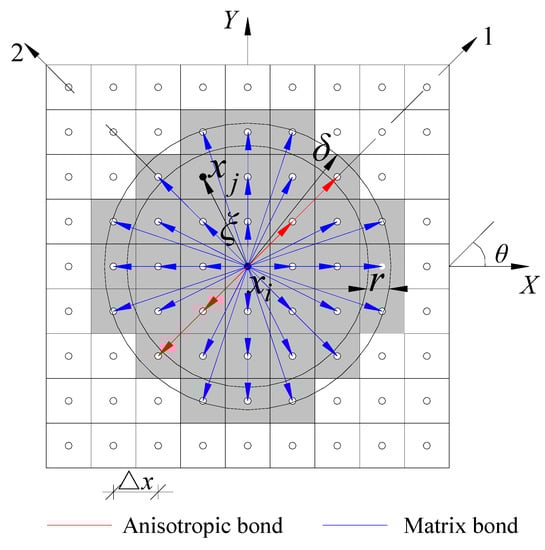 For 2D orthotropic FRC materials, it is assumed that the macroscopic mechanical properties (i.e., elastic modulus and Poisson’s ratio) and fracture criterion (i.e., critical stretch) in the angle θ direction (fiber direction) in the positive direction of the X-axis are different from those in other directions. As shown in Figure 3, the θ-oriented bonds are called fiber bonds, and the other arbitrarily oriented bonds are called matrix bonds. There are four independent material constants: elastic modulus E1 in the fiber bond direction, elastic modulus E2 in the matrix bond direction, Poisson’s ratio ν12, and shear modulus G12. The micromodulus c can be written as follows []: