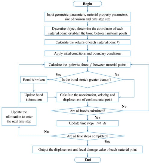 where n is the number of time steps. According to Silling et al. [], the value of time step Δt should meet Equation (29):