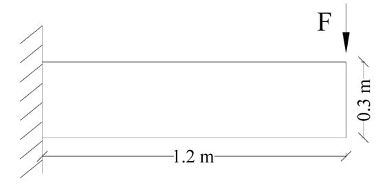 To compare the performance of the improved PD model with that of the classical PD model, an example of the cantilever beam under concentrated load was applied, as shown in Figure 6. Compared with other models, such as joint beams, the analytical solution of this example is simpler, and the difference between the simulation results of the two PD models can be compared more intuitively. The cantilever beam size was 1.2 m × 0.3 m, the left boundary was fixed, and the right free end applied a downward concentrated load F. The elastic modulus was 19 Gpa, the Poisson’s ratio was 1/3, and the density was 2400 kg/m3. The PD numerical model was discretized to 90,000 material points, with a node spacing Δx = 0.002 m, and the horizon δ = 3Δx.