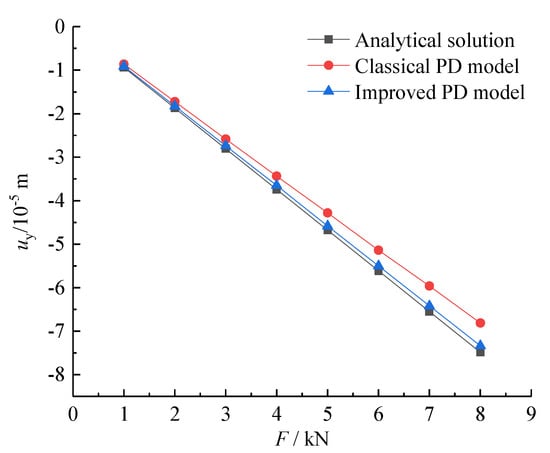 During the simulation, a concentrated load increment of 1 kN was gradually applied as an external force to the material point at the rightmost boundary of the beam. After each load increment was applied, the load continued to increase after reaching the calculation stability for a period of time. Figure 7 shows the change in the vertical displacement at the midpoint of the free end of the beam obtained from the theoretical analytical solution, classical PD model, and improved PD model under different concentrated loads. Compared with the classical PD model, the improved model was closer to the analytical solution, and had a higher calculation accuracy.