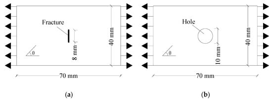 Geometric models of orthotropic thin plates with pre-existing flaws under tensile loads. (a) Flaw is a fracture; (b) Flaw is a hole.