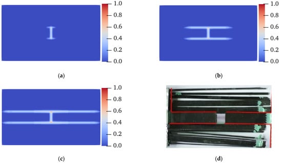 Experimental and PD simulation results of the tensile failure of a plate with fractures (θ = 0°). (a) 5.5 μs; (b) 8 μs; (c) 14 μs; (d) Experimental results [].
