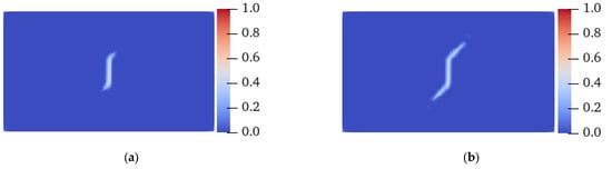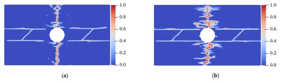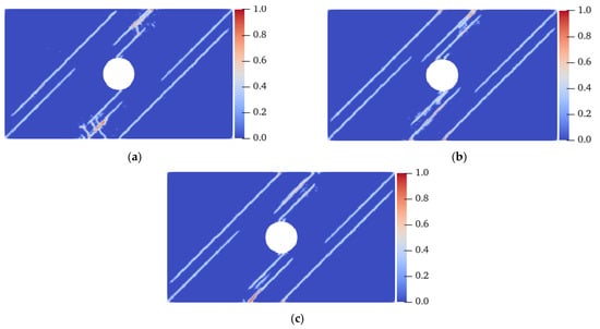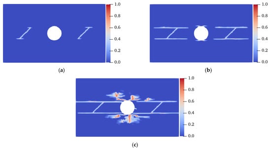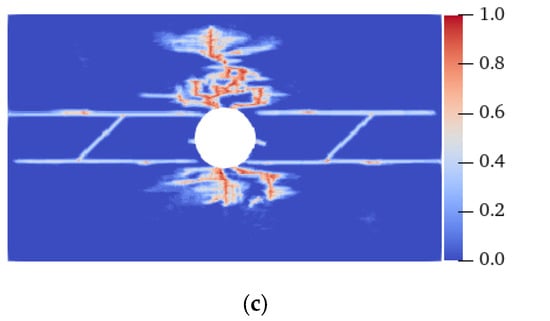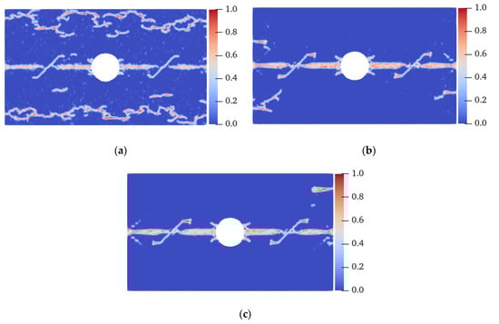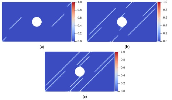 Failure modes of heterogeneous isotropic plates with flaws. (a) m = 10, 10.1 μs; (b) m = 20, 11.3 μs; (c) m = 30, 11.3 μs.