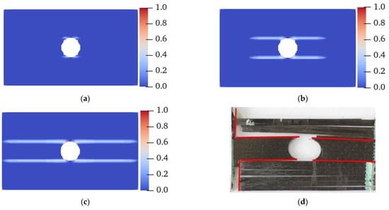 Experimental and PD simulation results of the tensile failure of a plate with holes (θ = 0°). (a) 5.5 μs; (b) 8 μs; (c) 15 μs; (d) Experimental results [].