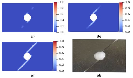 In this section, the ability of the improved PD model used to simulate the orthotropic fiber-reinforced materials is verified. In the reference experiment [], the fiber directions were 0° and 45°. Therefore, fiber bonds in the directions of 0° and 45° were also selected for simulation.