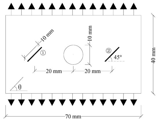 As shown in Figure 8, the experimental model developed by Liu et al. [] was used to verify the effectiveness of the improved PD model in predicting the crack propagation paths of fiber-reinforced orthotropic materials with flaws. The specimen was a unidirectional plate, which was prepared with M55J/Ag80 prepreg. The volume fraction of the fiber was 60% ± 3%, and the thickness of a single layer was 0.1 mm. The plate was 70 mm long and 40 mm wide. The prefabricated flaw was located at the center of the specimen, and the flaw included cracks and holes. The crack length was 8 mm, the inclination angle was 90°, and the hole diameter was 10 mm.