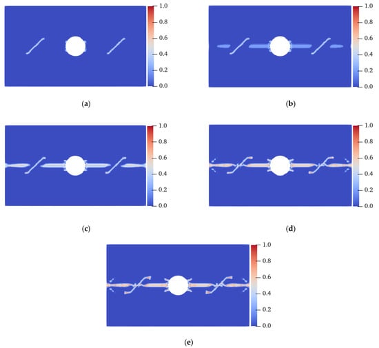 Crack propagation process of a homogeneous isotropic plate with flaws. (a) 8.8 μs; (b) 9.1 μs; (c) 9.5 μs; (d) 10.6 μs; (e) 11.3 μs.