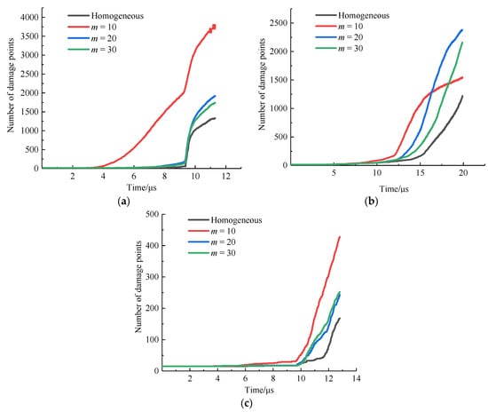 Under isotropic conditions (Figure 20a), the numbers of damage points were 1330, 3800, 1920, and 1740 at 11.3 μs when the specimens were homogeneous, and the m values were 10, 20, and 30, respectively. The lower the m value, the easier the specimen was to fracture. The stronger the rock heterogeneity, the greater the increase in the damage degree. At the same time, when m was 10, the damage degree of the specimen was significantly higher than that of the other three cases. When the m values were 20 and 30, there was a small difference in the number of damage points, indicating that within a certain range, the fracture characteristics of the rock are less affected by the homogeneity. When the degree of heterogeneity exceeded a certain value, the damage degree of the rock significantly increased. When the fiber bond was 0° (Figure 20b) and m was 10, the specimen first completely fractured at 14.8 μs, and then the increase in the number of damage points decreased. This is because when the specimen’s strength in the 0° direction increases, the fracture mode of the specimen changes from tensile fracture to mixed tensile–shear fracture. As for the fiber bond of 45° (Figure 20c), the variation in the number of damage points was similar to that in the case of the isotropic bond.