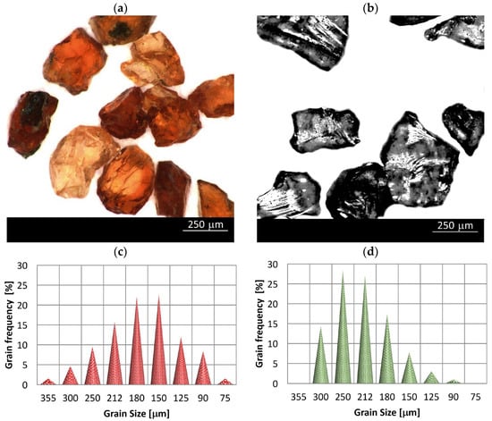 Grain view of: (a) GMR80 recycled garnet abrasive; (b) SPDG60 recycled glass abrasive and grain size distribution of: (c) GMR80 recycled garnet abrasive; (d) SPDG60 recycled glass abrasive.