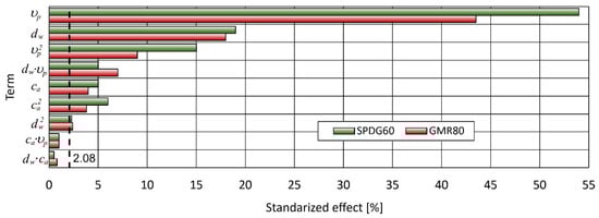 Pareto chart of the cutting standardized effects for GMR80 recycled garnet abrasive and SPDG60 glass abrasive.