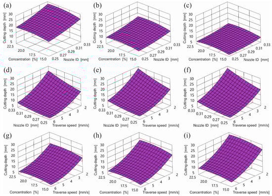 Influence of control parameters on cutting depth for SPDG60 recycled garnet abrasive in conditions: (a) feed rate 2 mm/s, (b) feed rate 4 mm/s, (c) feed rate 6 mm/s, (d) abrasive concentration 15%, (e) abrasive concentration 18.7%, (f) abrasive concentration 22.5%, (g) water nozzle ID 0.25 mm, (h) water nozzle ID 0.29 mm, (i) water nozzle ID 0.33 mm.