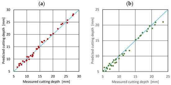 Scatter chart of the model and measured depth of cut for (a) GMR80 recycled garnet abrasive material, (b) SPDG60 glass abrasive material.