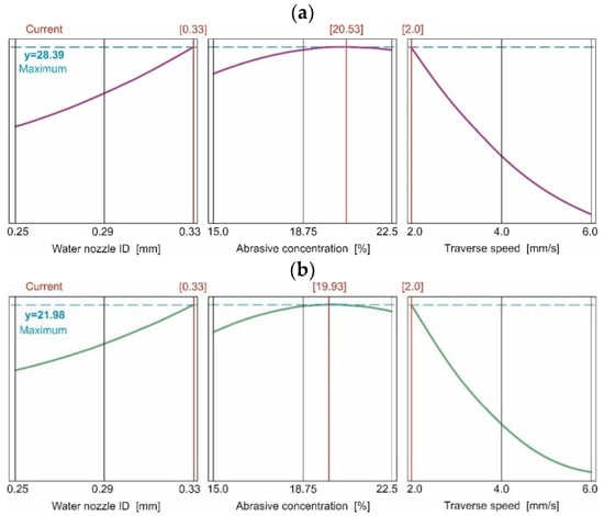 For GMR80 abrasive, the maximal depth of cut was reached at the concentration of 20.5% and amounted to 28.39 mm. For the SPDG60 abrasive, the maximum cutting depth was 21.98 mm, and it was achieved with a concentration of 19.93%. For both abrasives, the maximal depth of cut was reached for the major water nozzle ID and the lowest feed rate.