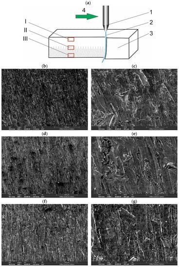 Samples of SEM cut surface photos achieved under optimal control parameters are presented Figure 7. Shallow machining marks deepening in the lower part of the material were observed. Under 200× magnification parallel traces of micro-cutting were visible in the upper part (I) of the sample, became less ordered in the middle (II), and finally in the lower zone (III). Particularly, the characteristic signs of erosion by the abrasive grains could be observed in Figure 7c,e,g. They are visible in the form of parallel tracks.