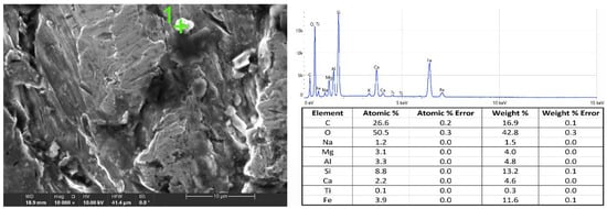 Abrasive grains, trapped in the workpiece, were also observed on the cut surface (Figure 8). This was confirmed by the EDS analysis, as both oxygen, silicon, and aluminum atoms were detected in the grain. However, their occurrence was sporadic. A similar shape was also taken by the chips formed during the cutting of the material.