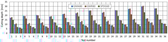 In comparison to the new garnet abrasive—GMA80 [], we can observe even 1.7% higher average cutting depth (Figure 9) when using recycled abrasive (GMR80). For crushed high density glass abrasive (SPDG60) the average cutting depth is 20% lower. However, the low cost of this recycled abrasive may make the use of this abrasive an economically viable alternative.