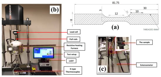 (a) Alloy 709 specimen geometry (dimensions in mm), (b) experimental electrodynamic testing machine setup for creep–fatigue tests, and (c) extensometer with LVDT.