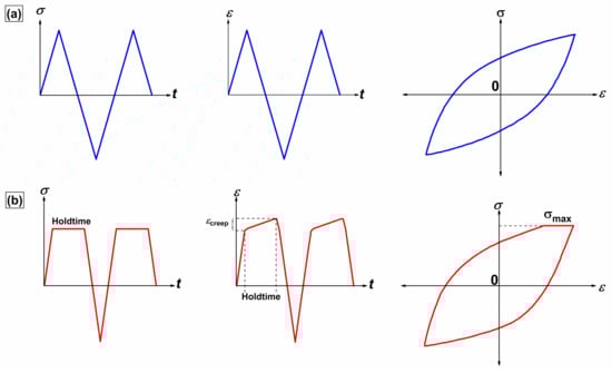 Schematics of loading cycle of stress-controlled creep–fatigue tests depicting stress–time, strain–time, and stress-strain curves (a) without a hold time and (b) with hold times imposed at tensile peak stress.