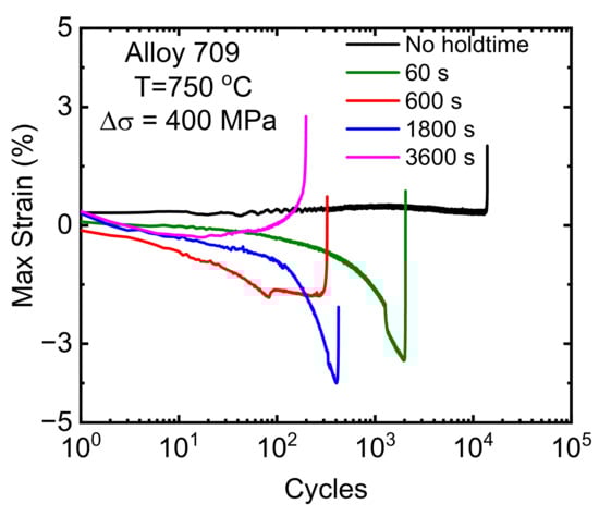 The change in the maximum strain at each hold time until failure versus the number of cycles is depicted in Figure 4. As shown, the plastic strain with no hold time (0 s) slowly increased at longer hold times, and the maximum strain evolved in the negative regime due to softening effect, as is explained below. However, at the 3600 s hold time, the maximum strain continued to rapidly increase at the end cycles (Figure 4).