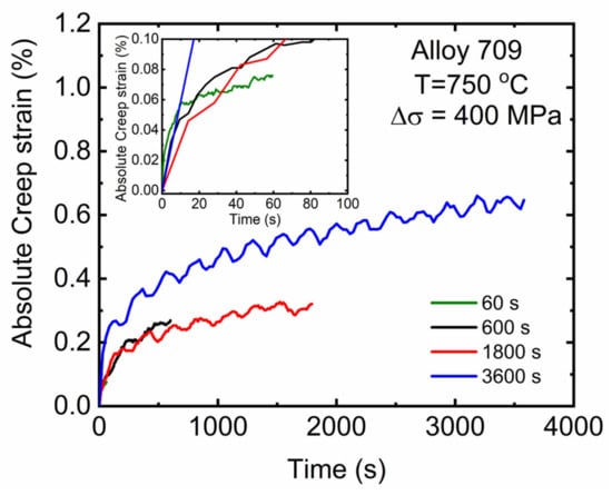 For the time-dependent plastic strain (creep), Figure 5 shows the absolute value of the creep strain accumulated during the half-life cycle at different hold times. The creep strain mainly represented the primary creep regime where the strain rate at the beginning of hold duration decreased with increasing hold time. However, the creep curve at 3600 s hold time entered the steady-state regime with an evaluated steady-state strain rate of 6.1 × 10−5 s−1. The values of strain rates obtained at all examined hold times were found to be very close to those observed in creep tests where a value of minimum creep rate of 7.51 × 10−7 s−1 was observed at the same examined temperature (750 °C) and applied stress (200 MPa) [23].