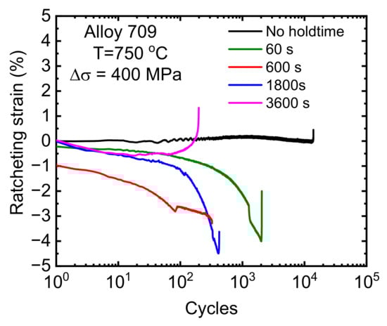 In this work, the creep–fatigue interaction of Alloy 709 was investigated under stress-controlled conditions at 750 °C and at a 400 MPa stress range with tensile hold times of 0, 60, 600, 1800, and 3600 s, at a stress rate of 80 MPa/s with a stress ratio of R = −1. The results were thoroughly discussed in terms of creep–fatigue life, along with the behavior of softening and the ratcheting strain and were compared with experimental data for other alloys.