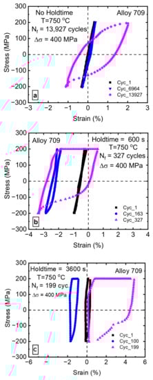 Hysteresis loops (first, midlife, and last cycles) of the stress-controlled creep–fatigue tests at 750 °C and hold times of (a) 0 s, (b) 600 s, and (c) 3600 s.