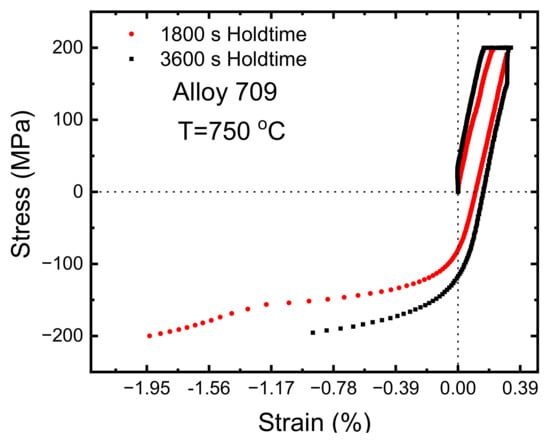 Various studies have reported softening behavior in Alloy 709 when tested at 750 °C or beyond, where detailed microstructural analyses have been performed [7,9,14,23,29,30]. Zhao et al. studied the tensile behavior and microstructure evolution of Alloy 709 from room temperature to 900 °C using in situ x-ray diffraction and found that material hardening dominated up to 500 °C, where dynamic strain aging started to occur [29]. Softening was found to be the dominating behavior from 700 to 900 °C, attributed to dynamic recovery and recrystallization. Lall et al. have performed strain-controlled creep–fatigue tests at 750 °C and found intergranular cavitation at longer hold times [9,30]. They showed that twin boundaries were impeding dislocation motion at longer hold times. For a better understanding of ratcheting and the shift of the hysteresis loop to the strain regime, the applied stress is the independent variable, and the strain is the dependent variable in stress-controlled creep–fatigue tests. It means that mechanical behavior is identified by observing the change in the maximum strain range in each cycle.