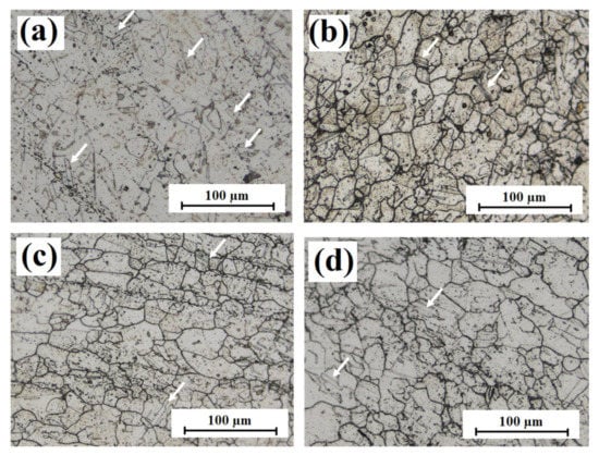Another manifestation of deformation by de-twining was illustrated in previous strain-controlled creep fatigue studies on Alloy 709, which revealed remarkable softening behavior. Higher dislocation density observed after testing ensured that piled up dislocations in virgin samples were recovered by stress-assisted processes. Unlike the low dislocation density observed in the as-received Alloy 709 [7], higher-density mobile dislocations developed after testing. Dislocations govern deformation behavior, implying a softer material with higher deformation tendency [1]. Creep–fatigue test initiated with tensile loading rate from 0 to 200 MPa in 2.5 s, followed by hold time, results in recovery of tangled dislocations leading to softening. Dislocations are recovered by climbing over obstacles in a stress-assisted diffusion process or by activity of partial dislocations leading to the annihilation of coherent/incoherent twin boundaries (de-twining). Figure 9 shows optical images of the as-received microstructure with a high density of twin boundaries compared with that following deformation (Figure 9b–d). When twin probability decreased, twin boundaries became more finely spaced in the tested samples along with shrinkage of twin planes. These observations were the manifestation of de-twining, as reported by many researchers in different metals [32,33,34,35].