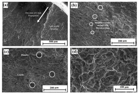 The fracture surfaces of Alloy 709 subjected to stress-controlled creep–fatigue tests at different hold times were characterized using scanning electron microscopy (SEM), and Figure 10a,b depicts the fracture surface after the fatigue test with no hold time. Low profile striations are observed in Figure 10a, indicating fatigue failure along with the direction of the crack propagation initiated at the surface of the sample; Figure 10b shows the dimpled fracture surface with the fibrous tearing of the microstructure. At 600 s of hold time, the formation of short cracks was noted in the inner region of the cross-section (Figure 10c), and such cracks indicated creep crack formation along with dimpled ductile voids due to fatigue. At the 3600 s hold time, larger cracks were found (Figure 10d), indicating dominant creep deformation with a lower probability of dimpled cavities. This agrees with Figure 5, where creep during 3600 s hold time reached the steady-state regime, allowing more creep deformation to occur compared with all other tests.