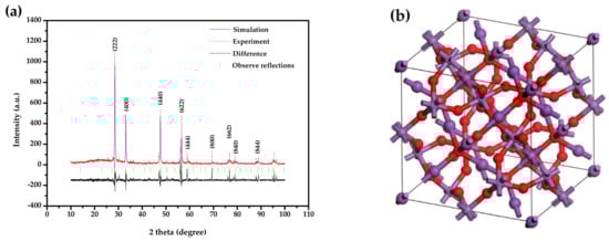 (a) XRD and corresponding Rietveld truing of Bi2SmSbO7 (red dotted line represents experimentative XRD datum of Bi2SmSbO7; blue solid line represents simulative XRD data of Bi2SmSbO7; black solid line is the disparity between experimentative XRD datum of Bi2SmSbO7 and analogous XRD datum of Bi2SmSbO7; green perpendicular is the observed reflective locality); (b) Atomy construction of Bi2SmSbO7. (Rubious atomy: O, dark purple atomy: Bi, light purpure atomy: Sm or Sb.).