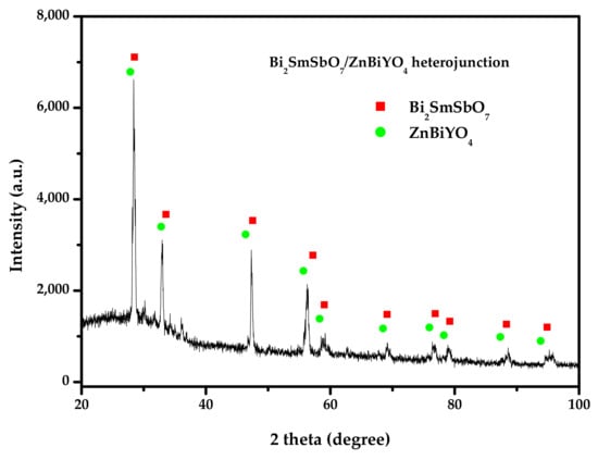 Figure 3 reveals the XRD spectrum of the Bi2SmSbO7/ZnBiYO4 heterojunction photocatalyst. It could be seen from Figure 3 that the pure single-crystal photocatalyst Bi2SmSbO7 and single phase photocatalyst ZnBiYO4 existed. Each diffraction peak of Bi2SmSbO7 and each diffraction peak of ZnBiYO4 were successfully marked, and other impurities were not found in Figure 3.