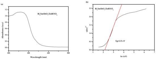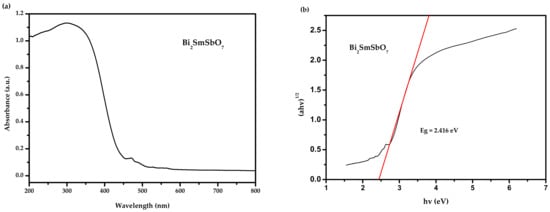 The absorbing spectra of the Bi2SmSbO7 sample are listed in Figure 4a,b. The absorption edge of this new photocatalyst Bi2SmSbO7 was at 458 nm which could be found within the seeable light range. The bandgap energy (BGE) of the crystal quasi-conductor was calculated by the Kubelka–Munk function (1) (known as the re-emission function) [86,87].
