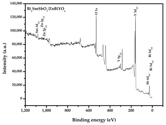So as to obtain the valence states and the surface chemical compositions of each element of Bi2SmSbO7/ZnBiYO4, the XPS was accomplished. Figure 7 shows the XPS comprehensive spectrogram of Bi2SmSbO7/ZnBiYO4. Figure 8 represents the XPS spectrogram of O2−, Bi3+, Sm3+, Zn2+, Y3+ and Sb5+, which are derived from Bi2SmSbO7/ZnBiYO4. Based on the XPS full spectrum, which was shown in Figure 7, the synthesized Bi2SmSbO7/ZnBiYO4 included the elements of Bi, Sm, Zn, Y, Sb and O. According to XPS analysis results, which was displayed in Figure 7 and Figure 8, the chemical valence of Bi, Sm, Zn, Bi, Y, Sb or O ion was equivalent to +3, +3, +2, +3, +3, +5 or −2. According to the results of the above analytical tests, the formulae for Bi2SmSbO7 and ZnBiYO4 could be determined. It can be seen from Figure 8 that various elemental peaks with specific binding energies were obtained. In Figure 8, the O1s peak of the O element is located at 529.90 eV. The position of the Bi5d3/2 and Bi5d5/2 peaks were fitted (located at 28.45 eV and 26.05 eV). The position of the Sm3d5/2 peak was at 1082.99 eV and the Sb4d3/2 peak was located at 35.20 eV. The position of Zn2p1/2 or Zn2p3/2 peaks were at 1041.72 eV and 1021.45 eV. The position of the Y3p3/2 peak of the Y element was at 301.05 eV. In short, Figure 7 and Figure 8 showed the existence of zinc (Zn2p), samarium (Sm3d), antimony (Sb4d), bismuth (Bi4f and Bi5d), Yttrium (Y3p) and oxygen (O1s) within the synthetical catalysts. The results of the superficial element characterization showed that the medial atomistic percentage of Bi:Sm:Sb:Zn:Y:O was equivalent to 940:262:285:384:402:7727. The atomistic proportion of Bi:Sm:Sb or Zn:Bi:Y in the catalyst of BZHP was equivalent to 2.09:1.00:1.09 and 1.00:1.02:1.05, respectively. The reason for the high oxygen value might be owing to the large amount of O which was sorbed on the superficies of Bi2SmSbO7/ZnBiYO4. Obviously, it showed that there were no other phases in the XPS peak of Bi2SmSbO7/ZnBiYO4 because neither shoulder nor expansion was observed.