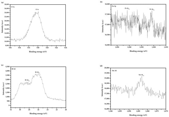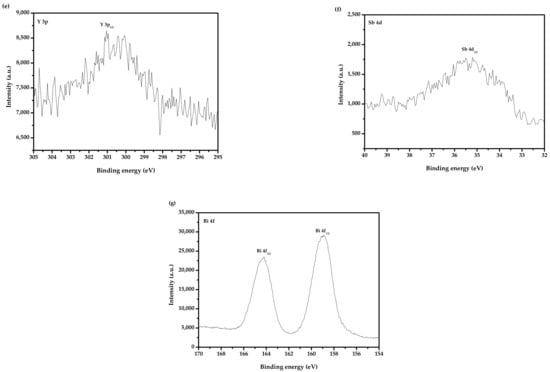 (a) XPS of O2− which derived from BZHP; (b) XPS of Zn2+ which came from BZHP; (c) XPS of Bi3+ (Bi5d) which came from BZHP; (d) XPS of Sm3+ which came from BZHP; (e) XPS of Y3+ which came from BZHP; (f) XPS of Sb5+ which came from BZHP; (g) XPS of Bi3+ (Bi4f) which was obtained from BZHP.