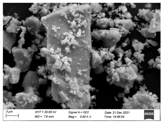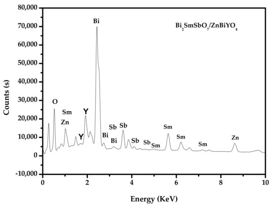 Figure 9 shows the SEM image of BZHP. Figure 10 shows the EDS elemental mapping of BZHP. Figure 11 shows the EDS spectra of BZHP. The results of Figure 9 and Figure 10 showed that the large dodecahedron structure belonged to Bi2SmSbO7, and the uniformly dispersed spherical flocculent small particles belonged to ZnBiYO4. Small particles of ZnBiYO4 were closely surrounded and loaded on the surface of large particles of Bi2SmSbO7. As could be seen from Figure 9 and Figure 10, the particles of Bi2SmSbO7 were surrounded by the smaller particles of ZnBiYO4 and all these particles were tightly bound together, which was a strong proof of the successful preparation of BZHP. Bi2SmSbO7 possessed a rhombic dodecahedron-like morphology. It was common sense that the distinct surface energy of crystallite facets controlled the structural growth of the photocatalyst. Previously, researchers have discovered that the Ag3PO4 (110) surface possessed a higher superficial energy when compared with the (111) surface, therefore, the crystal structure aggregated along the (110) direction, resulting in the formation of a rhombic dodecahedron-like morphology of silver phosphate [92,93]. It could be concluded that the reason why Bi2SmSbO7 possessed a diamond-shaped dodecahedron morphology might be illuminated in the above analysis. ZnBiYO4 possessed a regular spherical morphology and a uniform particle distribution (Figure 9). The particle size of Bi2SmSbO7 was approximately 2600 nm, while the particle size of ZnBiYO4 was approximately 1000 nm.