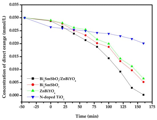 Figure 12 shows the concentration variance bights of DO during PD of DO with BZH as catalyst or with Bi2SmSbO7, ZnBiYO4 and N-dT as catalyst under VLI. It could be found from Figure 12 that the concentration of DO within dye wastewater gradually decreased with increasing visible light irradiation time when Bi2SmSbO7/ZnBiYO4 heterojunction or Bi2SmSbO7 or ZnBiYO4 or N-dT was utilized as a catalyst for degrading DO. In all the contrast experiments, the VLI time was set to be 160 min. The results which were obtained from Figure 12 showed that after VLI-160M, with BZH as the catalyst, the RR value of DO in dye wastewater achieved 99.10%, the reactive rate was equivalent to 3.097 × 10−9 mol·L−1·s−1, and the photon efficiency (PE) was equivalent to 0.0651%. With Bi2SmSbO7 as the photocatalyst or with ZnBiYO4 as the photocatalyst, the RR decreased. When Bi2SmSbO7, ZnBiYO4 or N-dT were utilized as the photocatalyst, the RR of DO achieved 82.57%, 78.13% or 32.83%, the rate of reaction was equivalent to 2.58 × 10−9 mol·L−1·s−1, 2.44 × 10−9 mol·L−1·s−1 or 1.03 × 10−9 mol·L−1·s−1, and the PE was equivalent to 0.0542%, 0.0513% or 0.0216%, respectively. Therefore, it was obvious that the photodegradation efficiency of DO was the highest when using BZHP. By calculating the contrast experimental results, the RR of DO by using BZH was 1.200 or 1.268 or 3.019 times higher than that with Bi2SmSbO7 as the catalyst, ZnBiYO4 as the catalyst or with N-dT as the catalyst. Using Bi2SmSbO7 as the photocatalyst or BZHP as the photocatalyst, respectively, the concentration of nulvalent Sb or Sb5+ in the aqueous solution before photocatalytic degradation of direct orange was zero. After VLI-160M for PD of DO, the content of nulvalent Sb or Sb5+ in the aqueous solution was also zero. Regarding the specific surface area, the specific surface area of Bi2SmSbO7 was 4.15 m2/g, the specific surface area of ZnBiYO4 was 4.06 m2/g, and the specific surface area of BZHP was 4.12 m2/g. All of our photocatalytic reactions (Figure 12) were realized by the photocatalysts which were prepared by the hydrothermal synthesis method; thus, it would not cause a difference in photocatalytic activity.