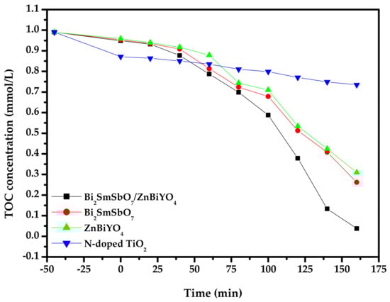 Concentration changing curved line of TOC during PD of DO in dye wastewater with Bi2SmSbO7/ZnBiYO4 heterojunction or with Bi2SmSbO7or with ZnBiYO4 or with N-doped TiO2 as catalyst under VLI.