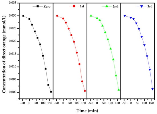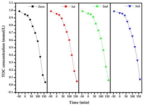 Figure 14 presents the concentration variation curves of DO during PD with Bi2SmSbO7/ZnBiYO4 heterojunction as the photocatalyst under VLI for three cycle degradation (TCD) tests. Figure 14 shows that the RR of DO reached 98.03%, 96.73% or 95.43%, respectively, after VLI-160M with Bi2SmSbO7/ZnBiYO4 heterojunction as catalyst by finishing 3 cycle experiments for removing DO. Figure 15 reveals the concentration changing curved line of TOC during PD of DO with BZH as the photocatalyst under VLI for TCD tests. We could observe from Figure 15 that the RR of TOC was 94.98%, 93.51% or 92.19%, respectively, after VLI-160M with BZH as the photocatalyst. The experimental results, which were obtained from Figure 14 and Figure 15, showed that the BZHP had high stability.