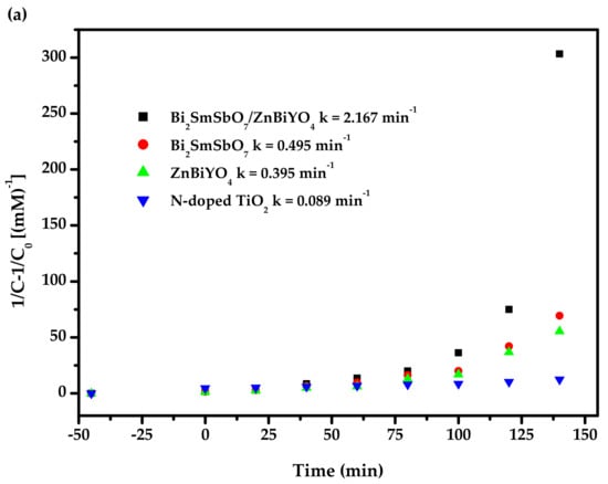 Figure 16 exhibits the second-order kinetic curves for the PD of DO with BZH, Bi2SmSbO7, ZnBiYO4 or N-dT as catalysts under VLI. According to Figure 16, the dynamic constant k, which was obtained from the kinetic plot toward DO concentration and VLI time with BZH, Bi2SmSbO7, ZnBiYO4 or N-dT as catalyst, reached 2.167 or 0.495 or 0.395 or 0.089 min−1, respectively. The dynamic constant k, which derived from the kinetic plot toward TOC concentration, was 0.047 or 0.010 or 0.009 or 0.002 min−1 with BZH, Bi2SmSbO7, ZnBiYO4 or N-dT as photocatalysts. The fact that the merical number of KTOC for removing DO was lower than the merical number of KC for removing DO, even though they were using the same catalyst, indicated that the photodegradation intermediate products probably appeared during the PD of DO under VLI. At the same time, the degradation of DO by BZHP showed higher mineralization efficiency compared with the other three photocatalysts.