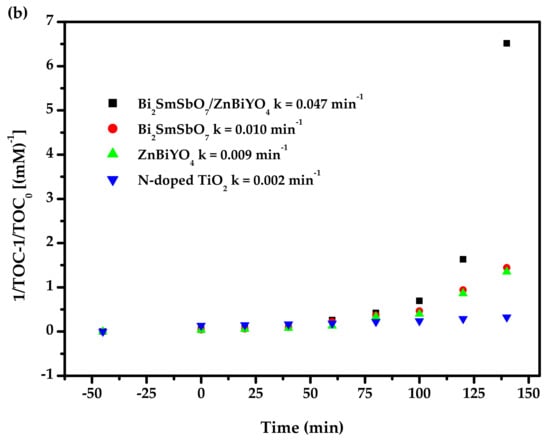 (a) Observed second-order dynamic curves for the PD of DO with Bi2SmSbO7/ZnBiYO4 heterojunction or with Bi2SmSbO7 or with ZnBiYO4 or with N-dT as catalyst under VLI; (b) Achieved second-order kinetic plots for TOC during PD of DO with BZH or with Bi2SmSbO7 or with ZnBiYO4 or with N-dT as catalyst under VLI.