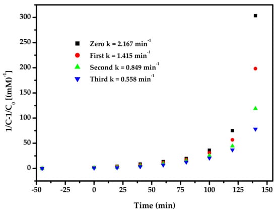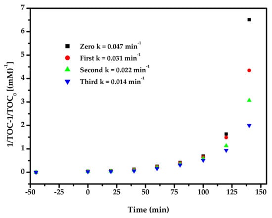 Figure 17 displays the observed second-order kinetic plots for the PD of DO with BZH as the photocatalyst under VLI for TCD tests. According to the results in Figure 17, the dynamic constant k, which was obtained from the kinetic plot towards the DO concentration and VLI time with BZH as the photocatalyst for TCD tests, was equivalent to 1.415 or 0.849 or 0.558 min−1. Figure 18 shows the achieved second-order dynamic curves for TOC during the PD of DO with BZH as catalyst under VLI for TCD tests. It could be found from Figure 18 that the kinetic constant k, which came from a dynamic curve towards the TOC concentration and VLI time with BZH as the photocatalyst for TCD tests, achieved 0.031 min−1 or 0.022 min−1 or 0.014 min−1. The results of Figure 16, Figure 17 and Figure 18 exhibited that the PD of DO with BZH as the photocatalyst under VLI coincided to the second-order reaction kinetics.