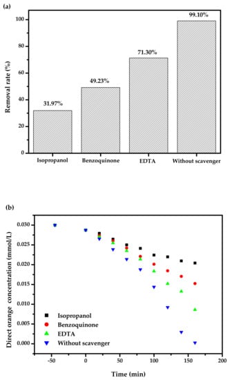Figure 19 exhibits the relation curves among ethylenediamine tetraacetic acid (EDTA), isopropanol (IPA) or benzoquinone (BQ) and RR of DO with BZH as the catalyst under VLI. At the beginning of the photo-catalysis experiment, different free radical scavengers were added to the DO solution to capture the active species during the degradation process of DO. Isopropanol (IPA) that we used to capture hydroxyl radicals (•OH), benzoquinone (BQ) that we utilized to capture superoxide anions (•O2−), and ethylenediaminetetraacetic acid (EDTA) that we used to capture holes (h+). The starting IPA concentration, BQ concentration or EDTA concentration was equivalent to 0.15 mmol L−1, and the added amount of IPA or BQ or EDTA was equivalent to 1 mL. Based on Figure 19, when the IPA, BQ or EDTA was put into the DO solution, the RR of DO decreased by 67.13%, 49.87% or 27.80%, respectively, compared with the standard RR of DO. Therefore, the conclusion could be drawn that in the process of DO degradation, •OH, h+ and •O2− were all active free radicals, and •OH played a leading role when using BZH as the photocatalyst to degrade DO under VLI. By using the experiment of adding a capture agent, it was found that the hydroxyl radical possessed the maximum oxidizing removal capability for eliminating DO in dye wastewater compared with superoxide anion or holes. The oxidizing removal capability for degradation DO was as follows: hydroxyl radical > superoxide anion > holes.