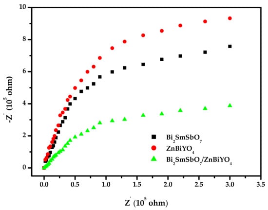 Nyquist impedance plots of Bi2SmSbO7/ZnBiYO4 heterojunction photocatalyst or Bi2SmSbO7 photocatalyst or ZnBiYO4 photocatalyst.