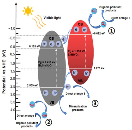 In the above two equations, Eg was the bandgap of the quasi-conductor, X was the electronegativity of the quasi-conductor and Ee was the free electronic energy on the hydrogen scale (Ee = 4.5 eV). The VB electric potential or the CB electric potential for Bi2SmSbO7 (determined by Formulas (3) and (4)) was equivalent to 2.539 eV or 0.123 eV, respectively. In addition, for ZnBiYO4, the VB electric potential and the CB electric potential were calculated to be 1.271 eV and −0.682 eV, respectively. It could be found that both Bi2SmSbO7 and ZnBiYO4 could assimilate seeable light and constitutionally generated electron–hole pairs when the BZHP was irradiated by VLI. Since the redox potential position of the CB of ZnBiYO4 (−0.682 eV) was more negative than that of Bi2SmSbO7 (0.123 eV), the photoinduced electrons on the CB of ZnBiYO4 could transform to the CB of Bi2SmSbO7. In addition, the redox potential position of the VB of Bi2SmSbO7 (2.539 eV) was more positive than that of ZnBiYO4 (1.271 eV), the photoinduced holes on the VB of Bi2SmSbO7 could transfer to the VB of ZnBiYO4. Hence, using BZHP, which consists of Bi2SmSbO7 and ZnBiYO4, would obviously diminish the reunion rate of photo-induced electrons and photo-induced holes. Moreover, the inner resistance would also decrease, and the lifespan of photoinduced electrons, photo-induced holes and the interfacial charge transfer would be enhanced [95]. As a result, more •OH or •O2− (oxidative radicals) could be manufactured, helping to raise the removal efficiency of DO. In Figure 21, the CB potential of ZnBiYO4 was −0.682 eV and the potential of O2/•O2− was −0.33 V, and more subtractive potential meant that the electrons within the CB of ZnBiYO4 could absorb oxygen to produce •O2− which could degrade DO. The value of the VB electric potential of Bi2SmSbO7 was (2.539 eV) larger than that of OH−/•OH (2.38 V), revealing that the holes in the VB of Bi2SmSbO7 could oxidize H2O or OH− into •OH for degrading DO, which was shown as path 2. Lastly, as shown in path 3, the photoinduced holes in the VB of Bi2SmSbO7 or ZnBiYO4 could straightly oxidize and remove DO owing to its strong oxidation capability. To sum up, the high efficiency of electron–hole separation was the reason that BZHP could promote DO degradation.