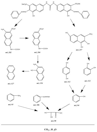 For the purpose of studying the degradation mechanism of DO, the intermediate products were also detected using the LC-MS method during the degradation process of DO. The intermediate products which were obtained during the PD of DO were identified as phenyldiazene (m/z = 106), naphtahlene (m/z = 127), aniline (m/z = 93), hydroquinone (m/z = 112), 1,2,6-trihydroxy-3-naphthalene sulfonate (m/z = 257), phenol (m/z = 94), oxalid acid (m/z = 90), C11H10O5N2S (m/z = 282), C11H9O5NS (m/z = 266) and 8-aminonaphthol (m/z = 152). Based on the detected intermediates, we could extrapolate the degradation pathway of DO, as shown in Figure 22. It could be found from Figure 22 that oxidation reaction and hydroxylation reaction were realized during PD process of DO. Ultimately, DO was converted into small molecular organic compounds and finally united with other organic active groups to convert into carbon dioxide and water.
