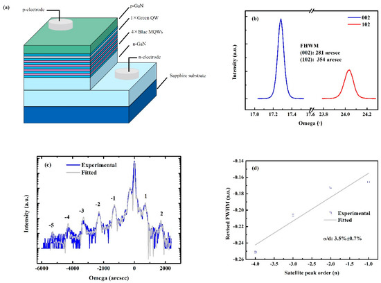 (a) The schematic illustration of LED structure. (b) The rocking curves of GaN (002) and (102) plane. (c) The ω-2 θ curve and the fitted line. (d) The revised FWHM of the satellite peaks. The light grey line is the fitted line. (e) The RSM image of the LED. The red dotted line is the guide line.