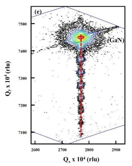 where w is the FHWM of the nth satellite peak, n is the order of satellite peaks, ΔθMn is the space between adjacent satellite peaks, M is the number of periods of MQWs, σ represents the interface roughness of the MQWs and d is the period thickness of the MQWs. The deduced interface roughness value is listed in Table 1, which is comparable to other InGaN MQWs [24]. The reciprocal space mapping (RSM) of the as-grown sample is depicted in Figure 1e. It is obvious that the MQWs are totally strained to the GaN template [25,26].